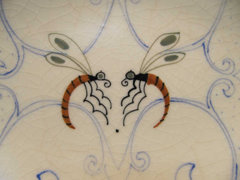 Arnhemse Fayence broodschaal met lineair decor van een paar insekten en bloemen.